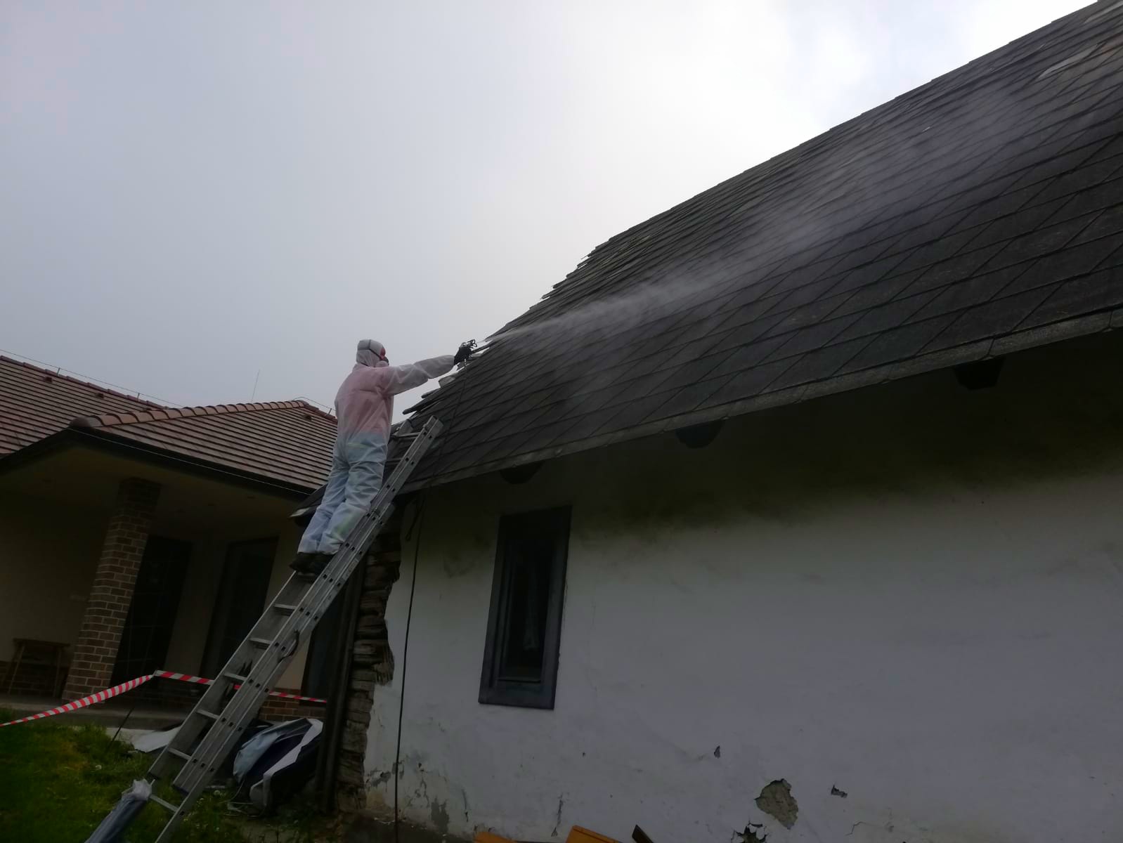 - Fixácia častíc: Aplikácia certifikovaného fixačného prostriedku (A – penetration power + A fibre absorbent) pomocou vysokotlakového Airless zariadenia. Tento krok zabezpečuje naviazanie azbestových vlákien na povrch materiálu ešte pred manipuláciou.